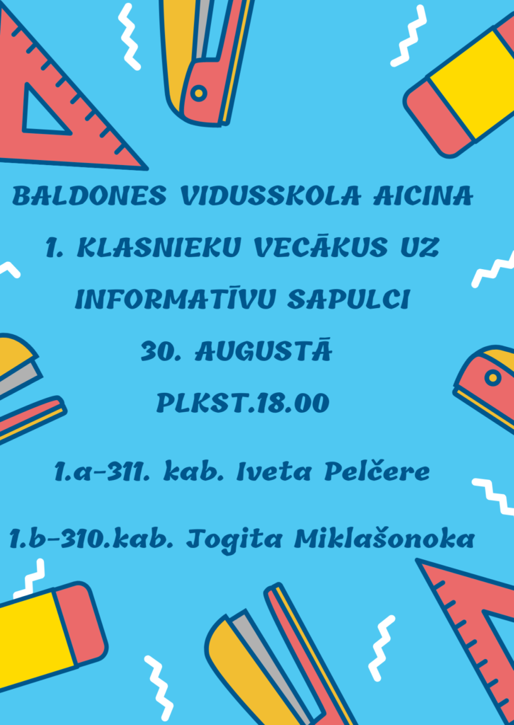 Baldones vidusskola aicina 1. klasnieku vecākus uz informatīvu sapulci š.g. 30.augustā plkst.18.00.