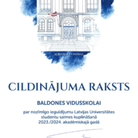 Baldones vidusskola ir saņēmusi Latvijas Universitātes cildinājuma rakstu kā atzinību par ieguldījumu skolēnu izglītošanā un sagatavošanā augstākajai izglītībai. Cildinājuma raksts ir piešķirts, balstoties uz 2024. gada datu analīzi, kurā pēc relatīvā vērtējuma skatīta skolas absolventu, kuri iestājās LU, skaita proporcija attiecībā pret kopējo skolas nobeiguma klašu skolēnu skaitu.