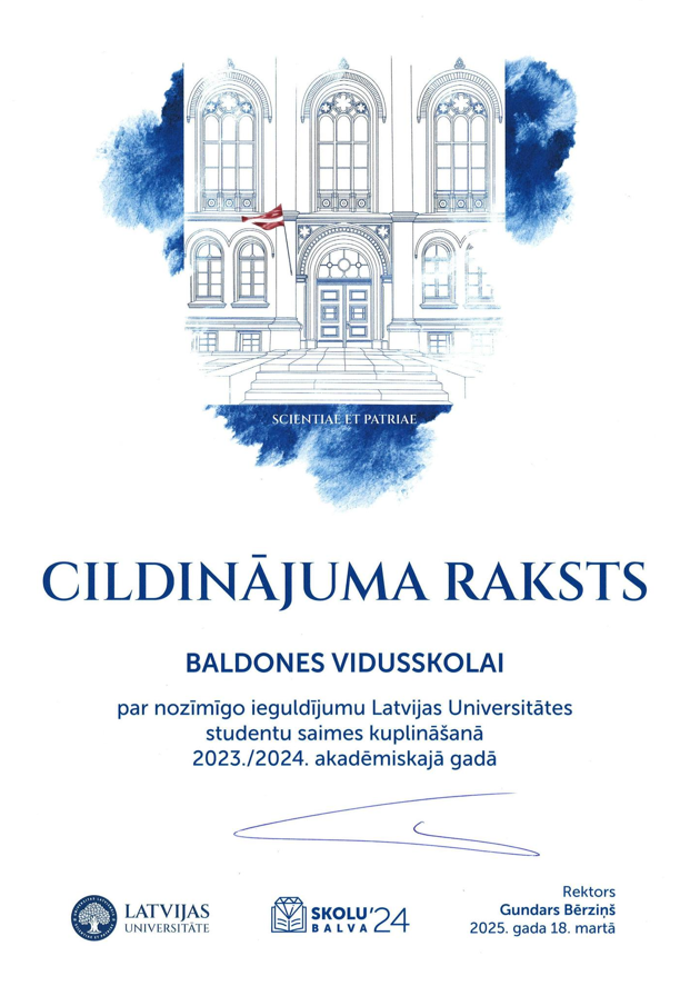 Baldones vidusskola ir saņēmusi Latvijas Universitātes cildinājuma rakstu kā atzinību par ieguldījumu skolēnu izglītošanā un sagatavošanā augstākajai izglītībai. Cildinājuma raksts ir piešķirts, balstoties uz 2024. gada datu analīzi, kurā pēc relatīvā vērtējuma skatīta skolas absolventu, kuri iestājās LU, skaita proporcija attiecībā pret kopējo skolas nobeiguma klašu skolēnu skaitu.