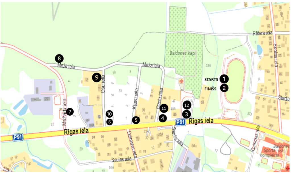 Maršruts – Baldones stadions – Rīgas iela – Mežvidu iela – Meža iela – Ošu iela-Kļavu iela– Ozolu iela – Rīgas iela – Baldones stadions.