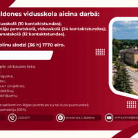 Baldones vidusskola aicina darbā: Bioloģijas skolotāju vidusskolā (12 kontaktstundas). Angļu valodas skolotāju pamatskolā, vidusskolā (24 kontaktstundas). Ķīmijas skolotāju pamatskolā (12 kontaktstundas). Minimālā likme par pilnu slodzi (36 h) 1770 eiro. Piedāvājam: Darba algas pieaugumu pēc pārbaudes laika. Veselības apdrošināšanu. 50% piemaksu pie atvaļinājuma. Prēmijas par papildu darbu. Iespēju iesaistīties Erasmus+ projektos. Labu, aktīvu pedagogu kolektīvu. Read More …