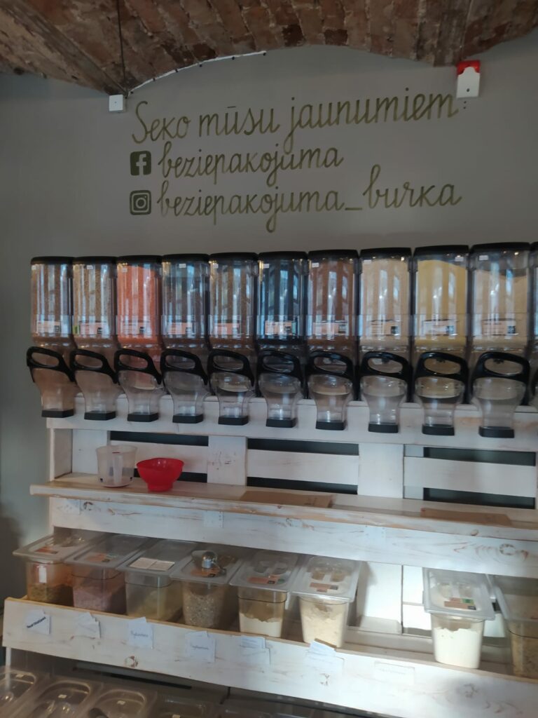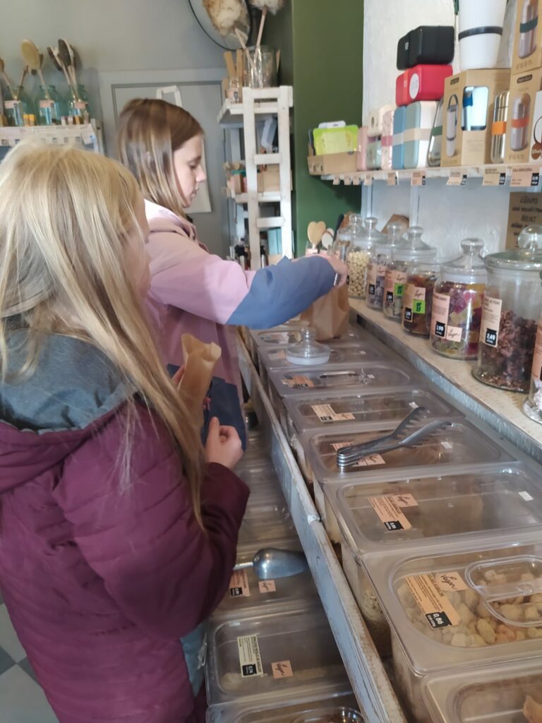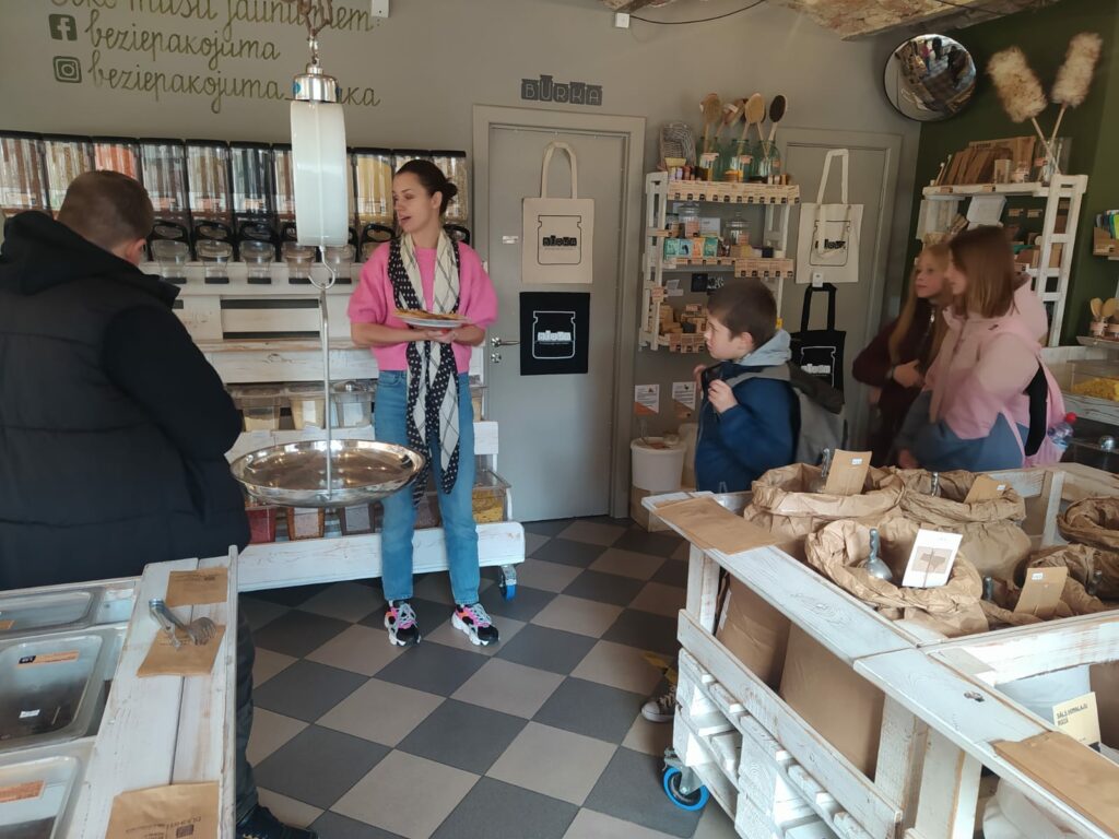 Pavasarī iesāktais ‘Zaļās jostas’ izaicinājums ‘Atkritumiem – nē!’ noslēdzās tikai tagad, rudenī. Skolēnu komanda jau izaugusi, šobrīd tie ir 5.a klases skolēni: Sindija, Marta, Anna, Rūdolfs un Rets. Turpinot pavasara tēmu – samazināt atkritumu daudzumu savās mājsaimniecībās – iepazinām beziepakojuma veikalu ‘Burka’. Mums pastāstīja par produktiem, ko var iegādāties šajā veikalā. Daļa no tiem ir labi zināmi: dažādi rieksti, žāvēti augļi; daži neparasti: kvinoja, lēcu makaroni u. c. Šeit ir iespēja iegādāties produktus vai nu savos līdzpaņemtos trauciņos vai veikala sagatavotās papīra turziņās. Veikalā var nopirkt ne tikai ēdamas lietas, bet arī izlejamos veļas mazgāšanas līdzekļus un šampūnu, ekoloģiskas ziepes, roku vasku, vaska drānas, ūdens pudeles un vēl daudz ko citu. Vairāk par produktiem un iespēju tos iegādāties var meklēt mājas lapā beziepakojuma.lv. Skolēni par šāda veida veikalu bija dzirdējuši, bet sajūsmu radīja iespēja šādu veikalu pašiem apskatīt, izpētīt un izmēģināt iepirkšanos.