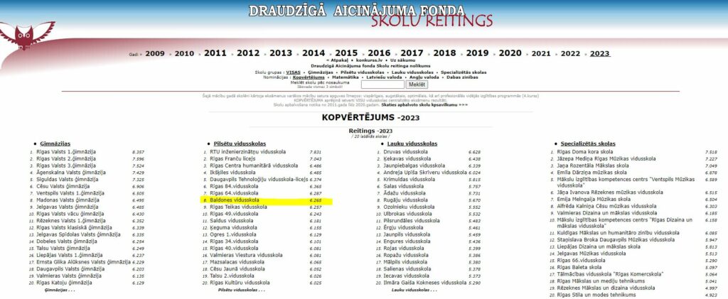 Draudzīgā Aicinājuma fonda Skolu reitingā 2023 pilsētu vidusskolu grupā Baldones vidusskola kopvērtējumā 8. vietā! Sociālo zinātņu eksāmenā – 1. vieta grupā! Latviešu valodas eksāmenā – 5. vieta Latvijā no 147 skolām! Lepojamies ar savu skolu!