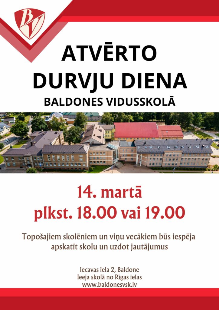 Atvērto durvju diena Baldones vidusskolā 2024. gada 14. martā administrators 2 gadiem ago 14. martā plkst. 18.00 vai 19.00 topošajiem skolēniem un viņu vecākiem būs iespēja apskatīt skolu un uzdot jautājumus