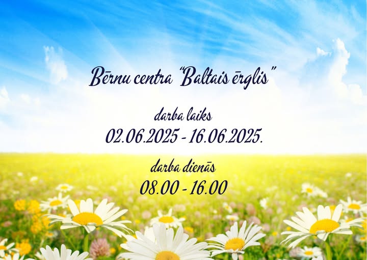 Bērnu centrs “Baltais ērglis” Posted on01/06/202511/08/2025Authoradministrators Darba laiks: 02.06.2025-16.06.2025 ; 8:00-16:00