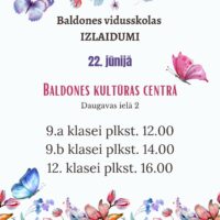 Dokumentu pieņemšana mācībām Baldones vidusskolas 10. klasē 2025./26.m.g. 27. jūnijā no 9.00 līdz 16.00, pēc tam katru darbdienu skolas lietvedībā no 9.00 līdz 14.00. Iesniedzamie dokumenti (klātienē): direktoram adresēts iesniegums pēc Baldones vidusskolas parauga; informācijas lapa (skolas veidlapa); personu apliecinoša dokumenta kopija(dzimšanas apliecība), uzrādot oriģinālu; medicīniskā karte 026/u; apliecības par pamatizglītību un sekmju izrakstu kopijas, Read More …