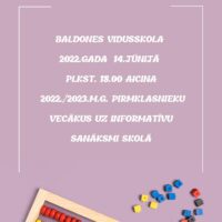 Baldones vidusskola 2022.gada 14.jūnijā plkst. 18.00 aicina 2022./2023.m.g. pirmklasnieku vecākus uz informatīvu sanāksmi skolā (Iecavas iela 2, Baldonē). Iesniegums 1.kl.