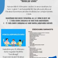 Aicinām līdz 15. februārim ziedot Ukrainas vienībām, kā Azov, Legion-V un Karpatskij Sič, kur plecu pie pleca ar Ukrainas karavīriem atrodas medmāsa no Latvijas Sarmīte Cīrule. Iesaistīšanās šajā akcijā ir brīvprātīga, un, ja ir vēlme to darīt, tad: 1. – 3. klašu skolēni ziedojumus var nodot klašu audzinātājiem; 4. – 12. klašu skolēni ziedojumus var Read More …