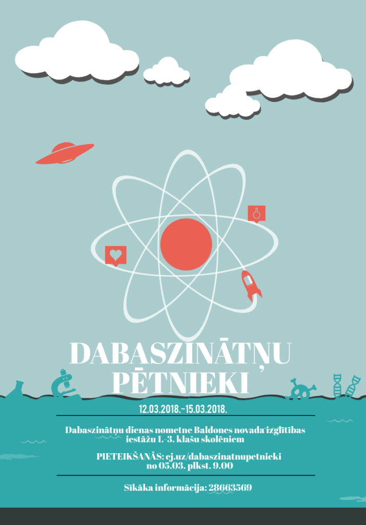 Baldones novada dome projekta “Atbalsts izglītojamo individuālo kompetenču attīstībai” (projekta nr. 8.3.2.2/16/I/001) ietvaros organizē dabaszinātņu nometni Baldones vidusskolas un Baldones Mūzikas pamatskolas 1.-3. klases skolēniem. Pieteikšanās no 05.03.2018. plkst. 9.00 elektroniski – ej.uz/dabaszinatnupetnieki