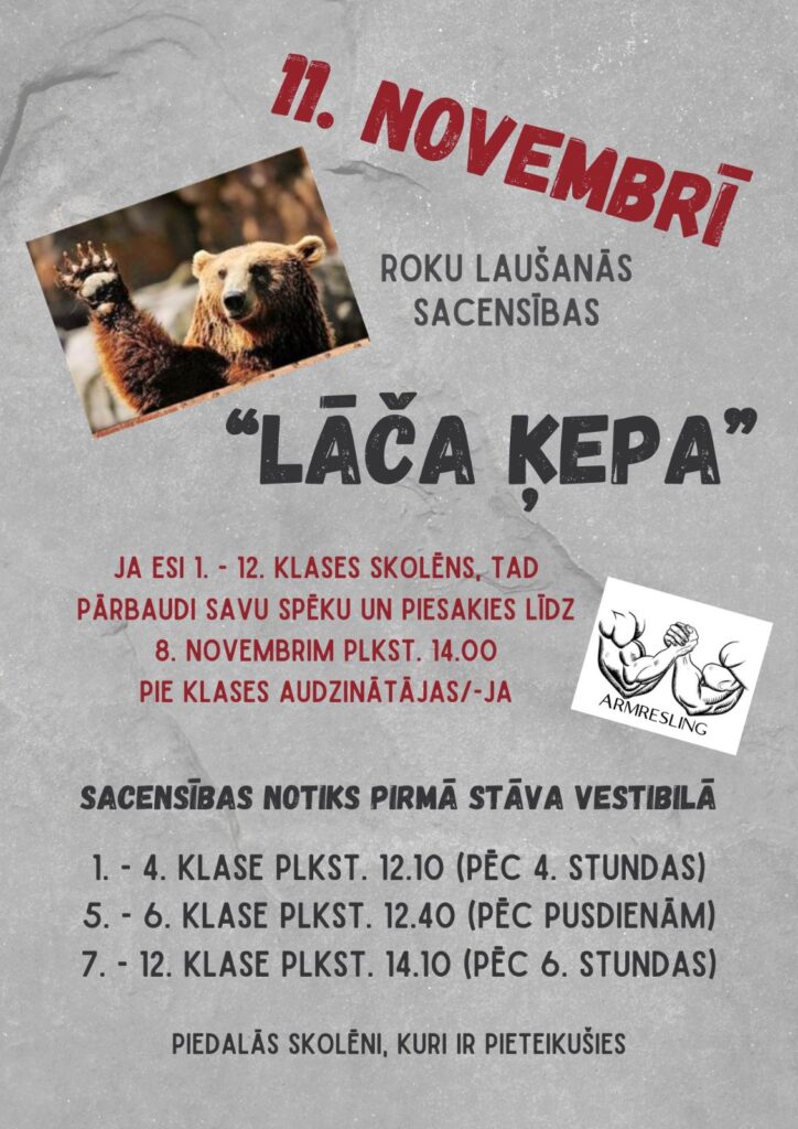 “Lāča ķepa” Posted on31/10/202403/11/2024Authoradministrators 11. novembrī roku laušanās sacensības: 1.-4.kl. plkst.12:10 5.-6.kl. plkst. 12:40 7.12.kl. plkst.14:10