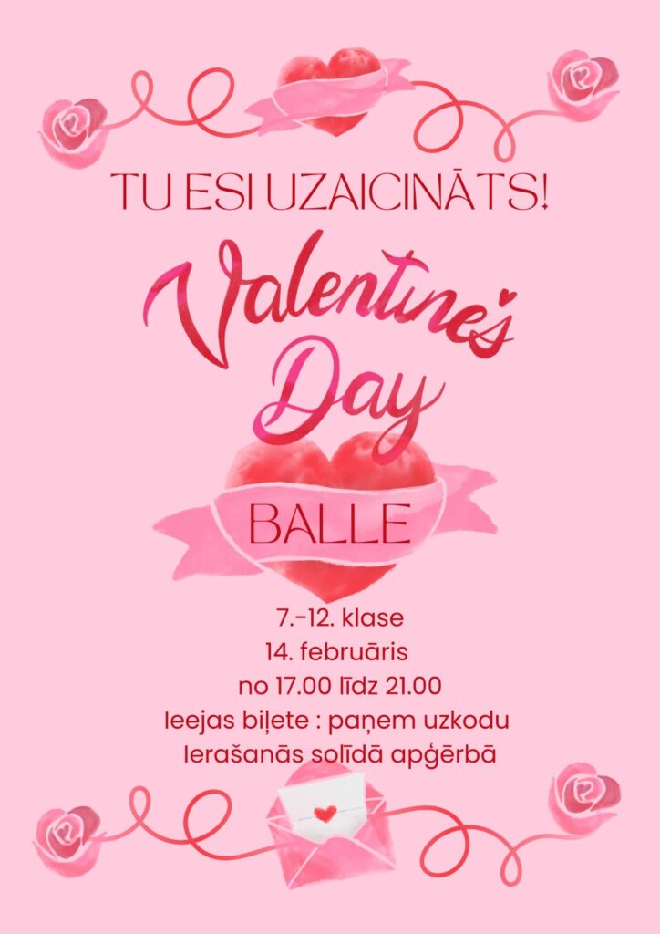 Valentīndienas balle 7.-12.klasei Posted on10/02/202510/02/2025Authoradministrators Valentīndienas balle 7.-12.klasei 14.februāris 17:00-21:00