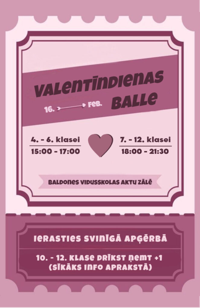 Valentīndienas balle 4.-12.klasei Posted on05/02/202408/02/2024Authoradministrators 16. februārī Valentīndienas balle: 4.-6.klasei 15:00-17:00; 7.-12.klasei 18:00-21:30 vidusskolas aktu zālē