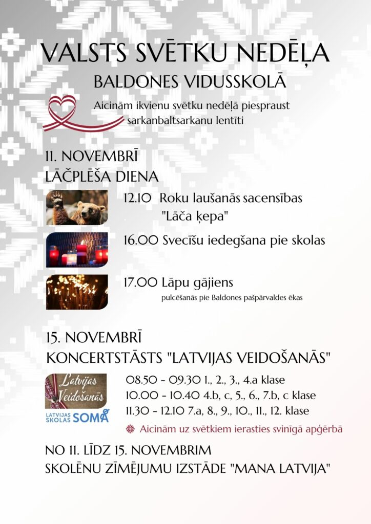 Valsts svētku nedēļa Posted on11/11/2024Authoradministrators 11. novembrī-Roku laušanās sacensības 15. novembrī-Koncertsāsts “Latvijas veidošanās”