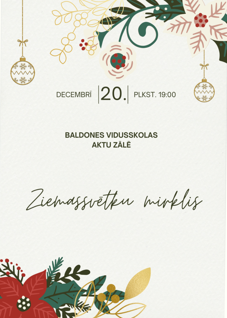 Ziemassvētku koncerts administrators 2 gadiem ago 20. decembrī plkst. 19:00 Baldones vidusskolas aktu zālē Ziemassvētku koncerts vecākiem “Ziemassvētku mirklis”.